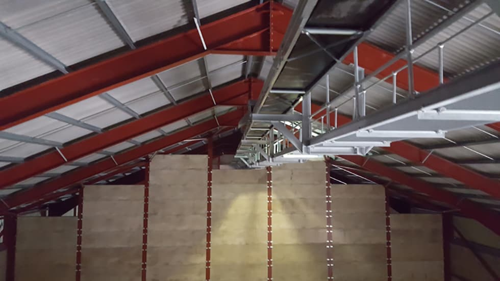Як тільки зерно проходить через сушарку, воно транспортується на склади двома нахиленими конвеєрами, які відповідають куту нахилу даху, потім зерно подається на верхні конвеєри, які переносять його вниз з вершини складів. Комплекс був змонтований Darren Rouse Technical services, а електрична система була спроектована та змонтована Hadley Electrical Contractors Ltd.