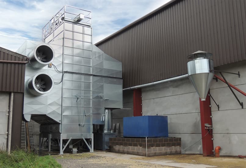 Тепер у нього є прямолінійна система, що включає 12-метровий траншейний прийом з проїзною решіткою (виготовленою паном Терні), приймальний бункер також подвоюється як зона утримання вологого зерна і може вміщати приблизно 150 тонн продукту. Це не лише економить значну суму грошей порівняно з наявністю ємності для зберігання вологого зерна та додаткового транспортного обладнання, але також полегшує експлуатацію комплексу. Завальна яма має інверторне управління всередині панелі (розробленої та постаченої Perry). З прийому зерно проходить через аспіратор-очищувач продуктивністю 60 т/год, а потім піднімається в сушарку M410 продуктивністю 30 т/год за допомогою двохпотікової норії продуктивністю 60 т/год та конвеєра прямого та зворотного потоку продуктивністю 60 т/год. Все, що не подається в сушарку, повертається назад у яму.