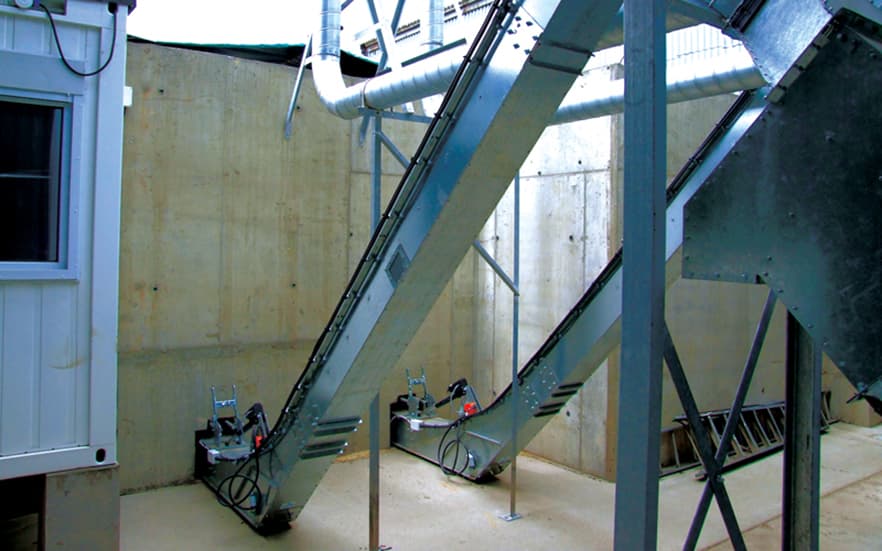 Цей конвеєр ідеально підходить для подачі в башмак норії, щоб уникнути бетонних приямків. Продуктивності варіюються від 60 до 350 т/год при кутах до 60 градусів. Ця машина підходить як для сільськогосподарського, так і для промислового застосування.