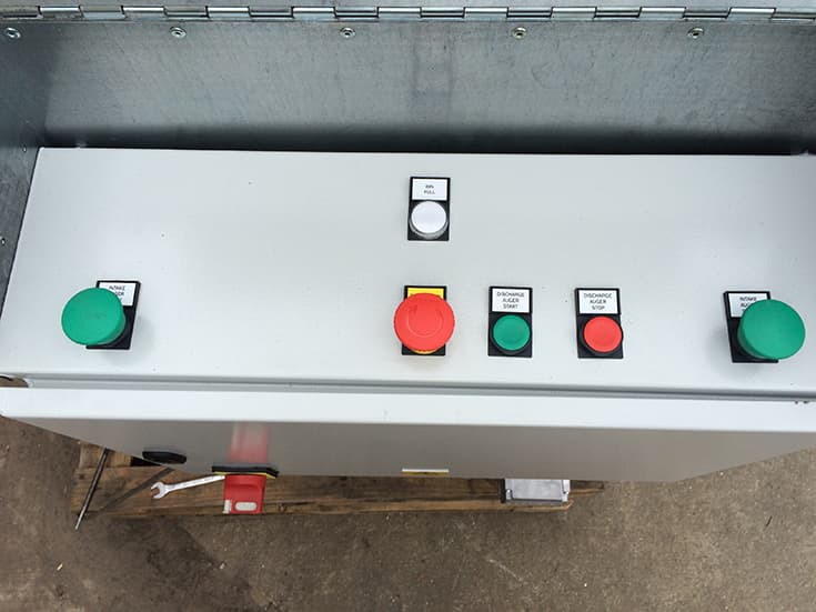 - У стандартну комплектацію блоку управління з натискними кнопками входять кнопки аварійного зупину та запуску шнека, а також шафа, на якій вони розташовані. Вони ні до чого не прикріплені і повинні монтуватися в межах 1м при перекидному бункері з метою безпеки. НІЯКИХ індикаторів рівня ємності або датчиків закупорювання немає.