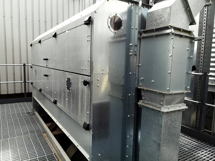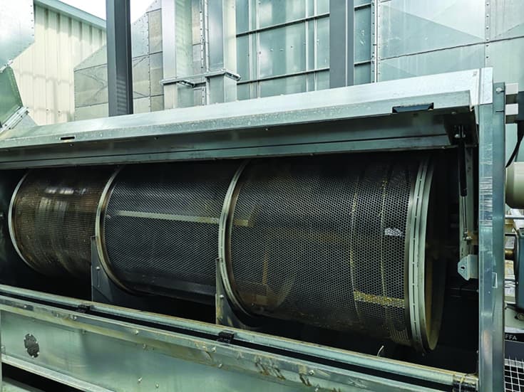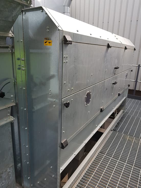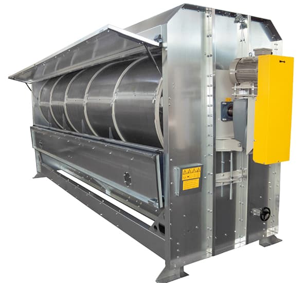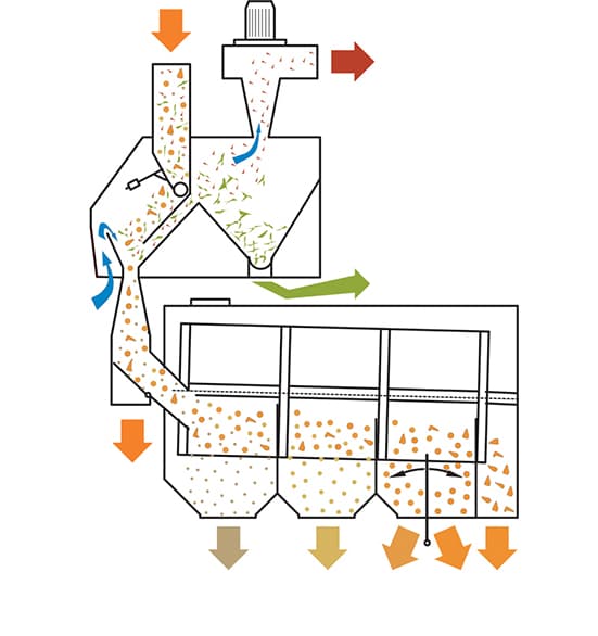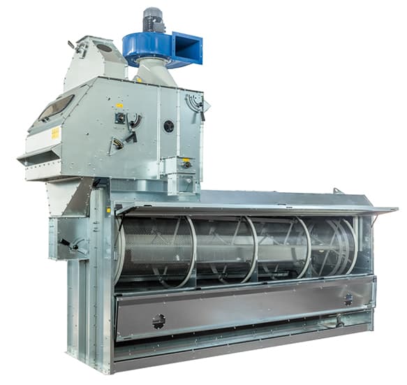 Продукт самопливом подається в роликовий розподільник з електроприводом, де він рівномірно розподіляється по всій ширині ролика; наступна завіса продукту при спуску стикається з поперечним повітряним потоком, який видаляє найлегші домішки та відокремлює частину більш важких домішок у осадочний бункер, обладнаний шнеком для видалення відходів. Продукт без пилу надходить у циліндричний обертовий барабан, покритий змінними перфорованими ситами. Перше сито видаляє дрібніші домішки (пісок, подрібнений продукт тощо). Наступні сита дозволяють продукту проходити через заздалегідь підібрані перфораційні отвори, в той час як будь-які більш крупні домішки потрапляють в кінець барабана. Тип встановлених сит визначається типом продукту та типом відбраковуваного матеріалу, який необхідно відокремити.