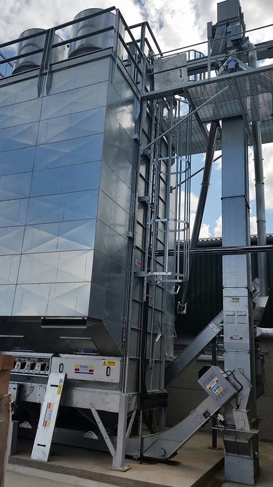 Сушарка Perry продуктивністю 22 т/год була змонтована зовні, а навколо сушарки було побудовано будівлю, щоб вирівняти яму та забезпечити більш ефективний потік продукту через систему. Сушарка висока та вузька для забезпечення мінімально можливого посадочного місця. Вентилятори встановлені вертикально, щоб зберегти мале посадочне місце сушарки та допомогти знизити рівень шуму, оскільки у пана Мітчелла є будинки по обидва боки від ферми, а офіс на майданчику розташований поряд із сушаркою.