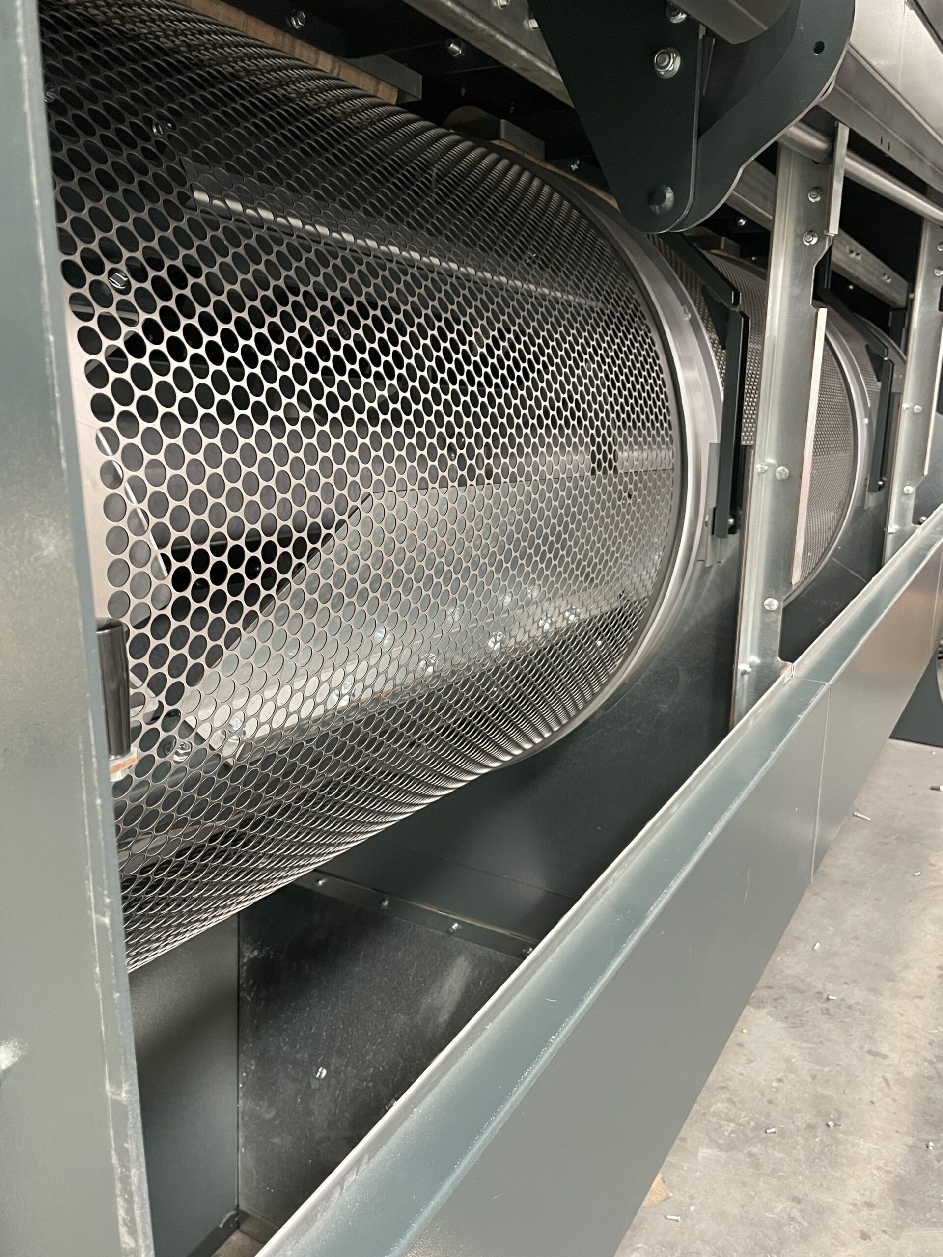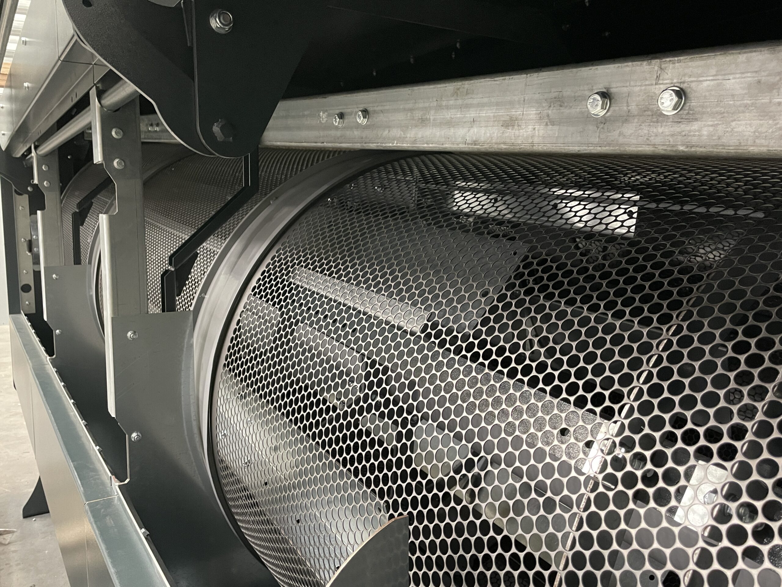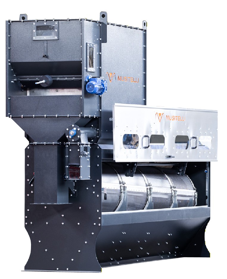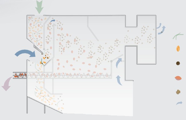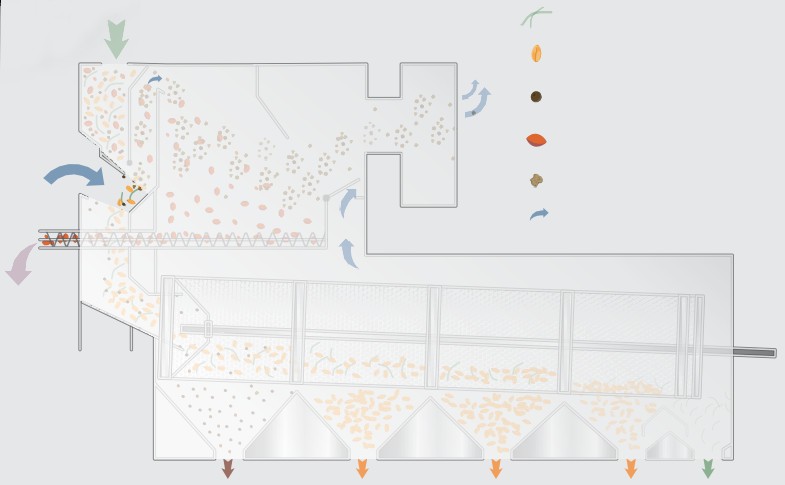 Продукт самопливом подається в роликовий розподільник з електроприводом, де він рівномірно розподіляється по всій ширині ролика; наступна завіса продукту при спуску стикається з поперечним повітряним потоком, який видаляє найлегші домішки та відокремлює частину більш важких домішок у осадочний бункер, обладнаний шнеком для видалення відходів. Продукт без пилу надходить у циліндричний обертовий барабан, покритий змінними перфорованими ситами. Перше сито видаляє дрібніші домішки (пісок, подрібнений продукт тощо). Наступні сита дозволяють продукту проходити через заздалегідь підібрані перфораційні отвори, в той час як будь-які більш крупні домішки потрапляють в кінець барабана. Тип встановлених сит визначається типом продукту та типом відбраковуваного матеріалу, який необхідно відокремити.